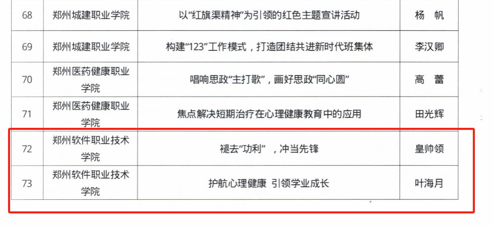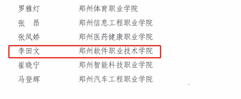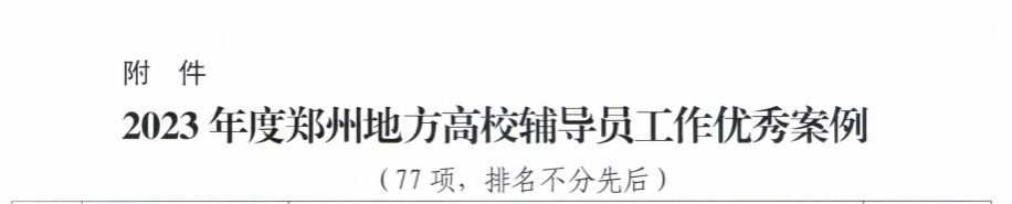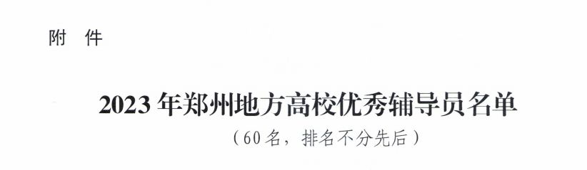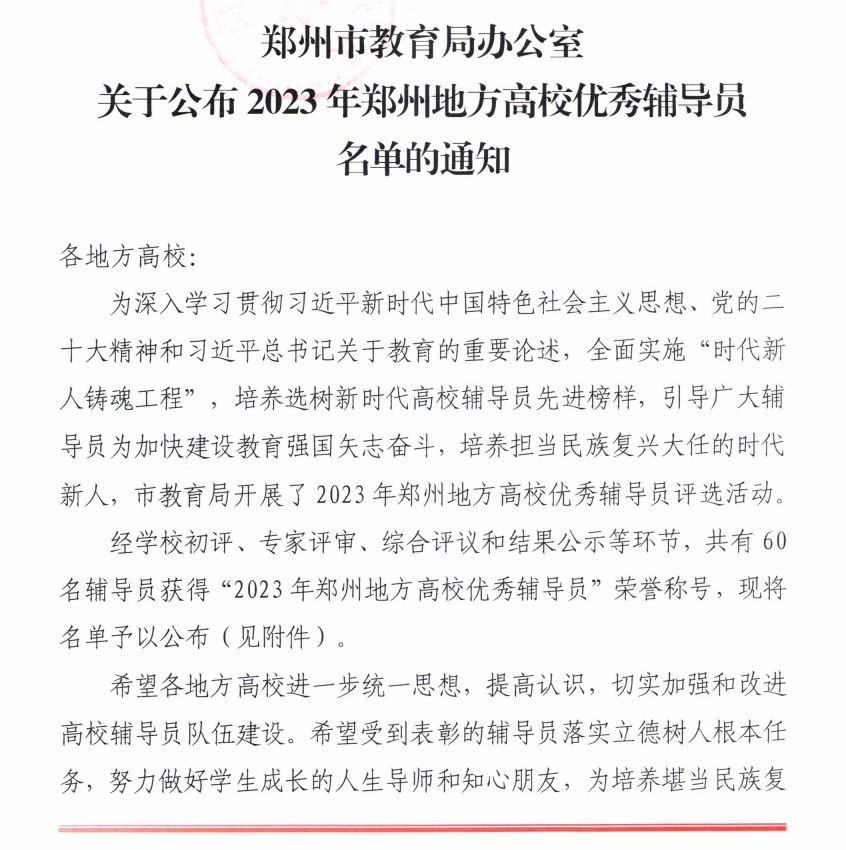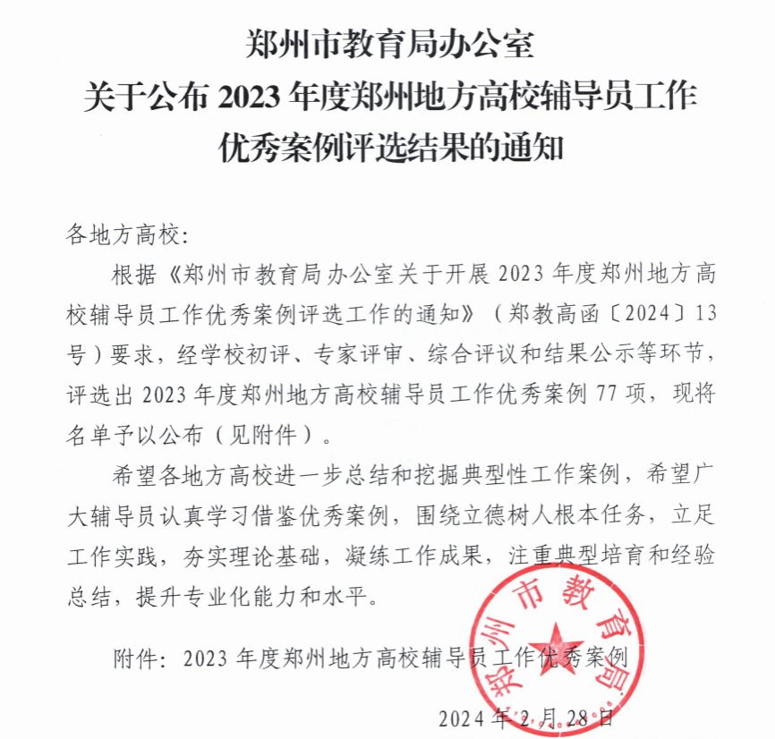 近日🦶,根据郑州市教育局办公室发布的《关于公布2023年度郑州地方高校辅导员工作优秀案例评选结果的通知》(郑教高函﹝2024﹞126号)、《关于公布2023年郑州地方高校优秀辅导员名单的通知》(郑教高函﹝2024﹞127号)文件。我校李田文老师荣获“2023年度郑州地方高校优秀辅导员”称号。皇帅领老师申报的案例《褪去“功利”,冲当先锋》🫚、叶海月老师申报的案例《护航心理健康 引领学业成长》成功入选2023年郑州地方高校辅导员工作优秀案例。