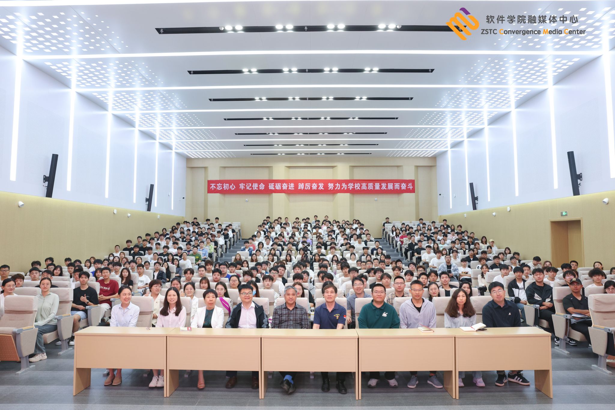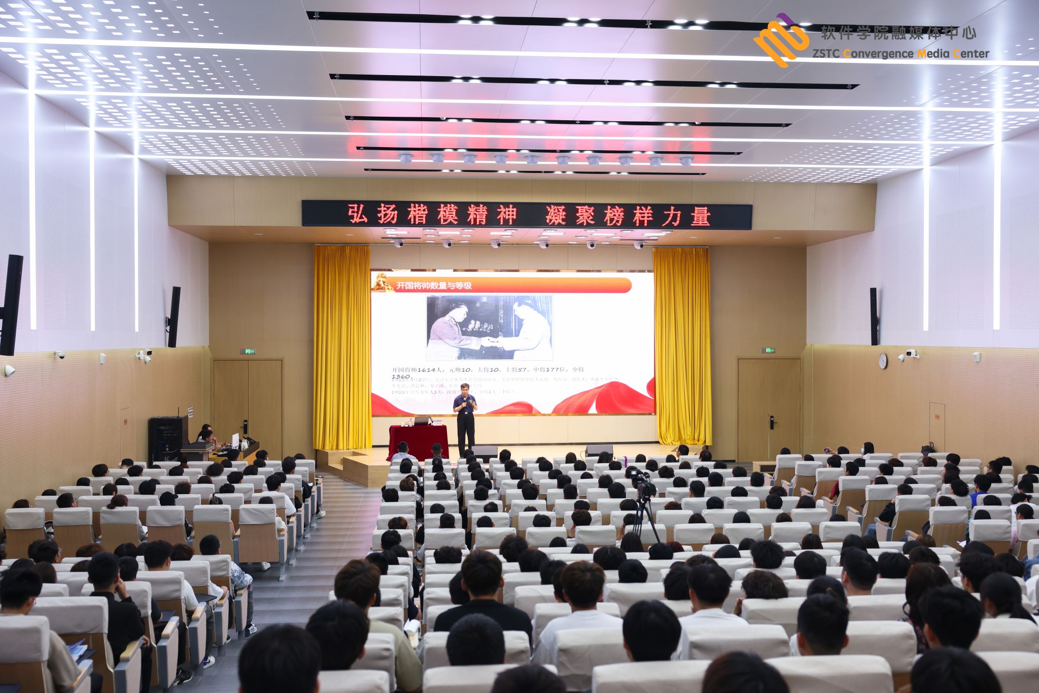 在报告中,卜团长结合自己采访300余位开国将军和英模人物的丰富经历,通过详实的资料👨🏽🔬、生动的图片和影像,向师生们讲述了多位开国将军和英模人物的感人故事。从百岁入党的心外科专家苏鸿熙到将思念刻在星星上🧖♀️,将使命写在星河里的航天英雄王亚平;从一生只干两件事“学习”和“捐助”的公孙萍到个人荣辱得失比诸国家利益实在是微不足道的百岁专家钟英;从无手亦能写春秋的谭荒芳到“一门三院士”的黎氏三兄弟;从一生干了3件事®️,3件事干了一生的王永志到我的梦想就是修铁路的蔡报瑗🧺。一个个鲜活的人物,一段段感人的故事是雷锋精神的传承,更是雷锋精神在当代社会的展现,引发郑软学子的强烈共鸣,现场掌声雷动🚶♂️。