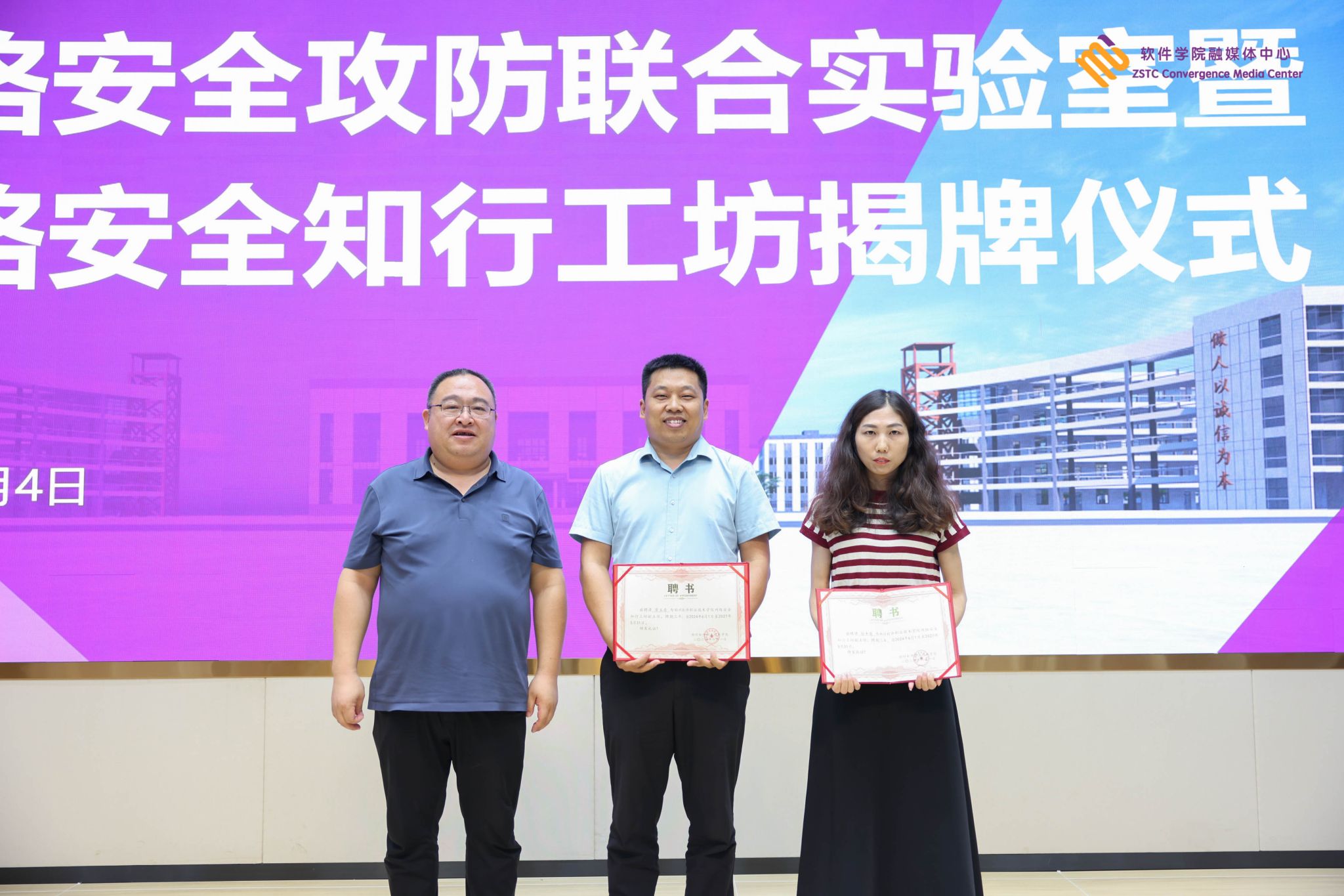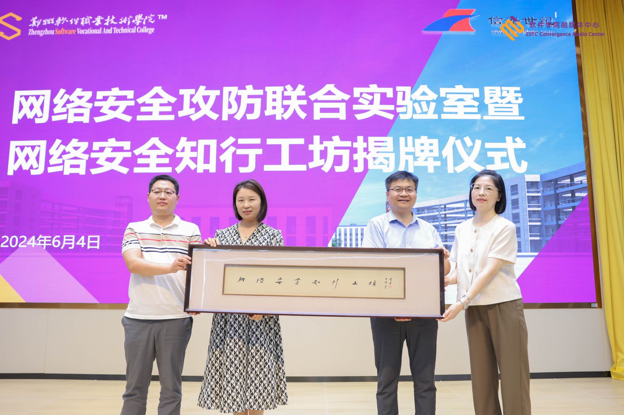 河南信安世纪科技有限公司副总经理陈敏,河南信安教育咨询有限公司总经理李小龙赠送《网络安全知行工坊》牌。