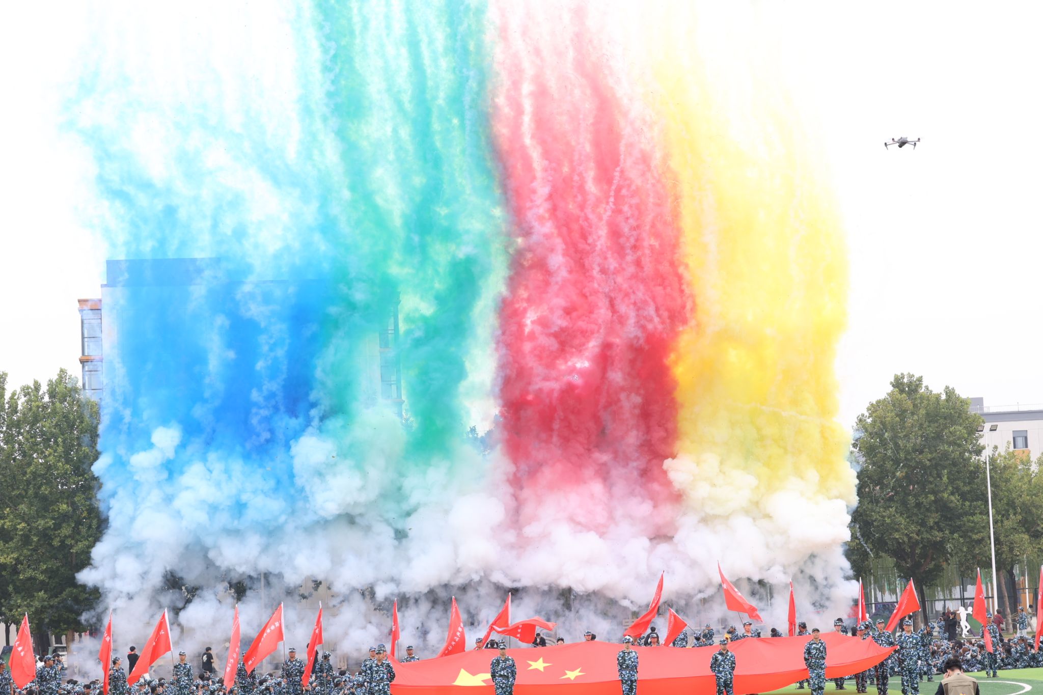礼炮声声震天响,伴随着雄壮的国歌声𓀎🧛🏻♂️,鲜艳的五星红旗冉冉升起✊🏽,全体师生面向国旗,肃穆而立👨🎤,行注目礼😶🌫️,2024级新生军训汇演拉开序幕。