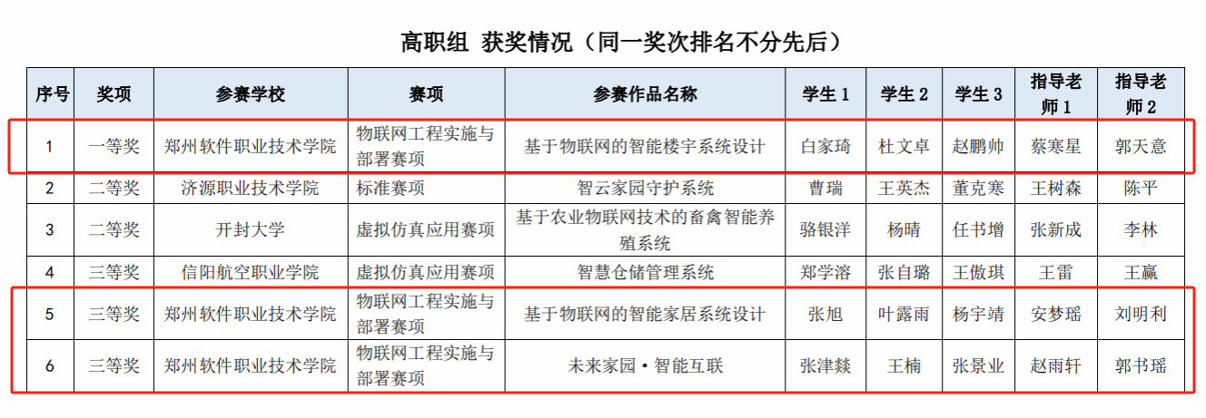 在本次大赛中,人工智能学院团队精心准备、全力以赴🌓。经过激烈的角逐与严格的评审,最终蔡寒星老师🐠、郭天意老师指导的《基于物联网的智能楼宇系统设计》作品,以独特的创意🪞、卓越的技术实现和良好的应用前景,赢得了评委的高度认可,荣获河南省一等奖🦞;安梦瑶⚅、刘明利老师指导的《基于物联网的智能家居系统设计》和赵雨轩、郭书瑶老师指导的《未来家园·智能互联》两个作品也表现优异📣🧘🏻♂️,荣获河南省三等奖。