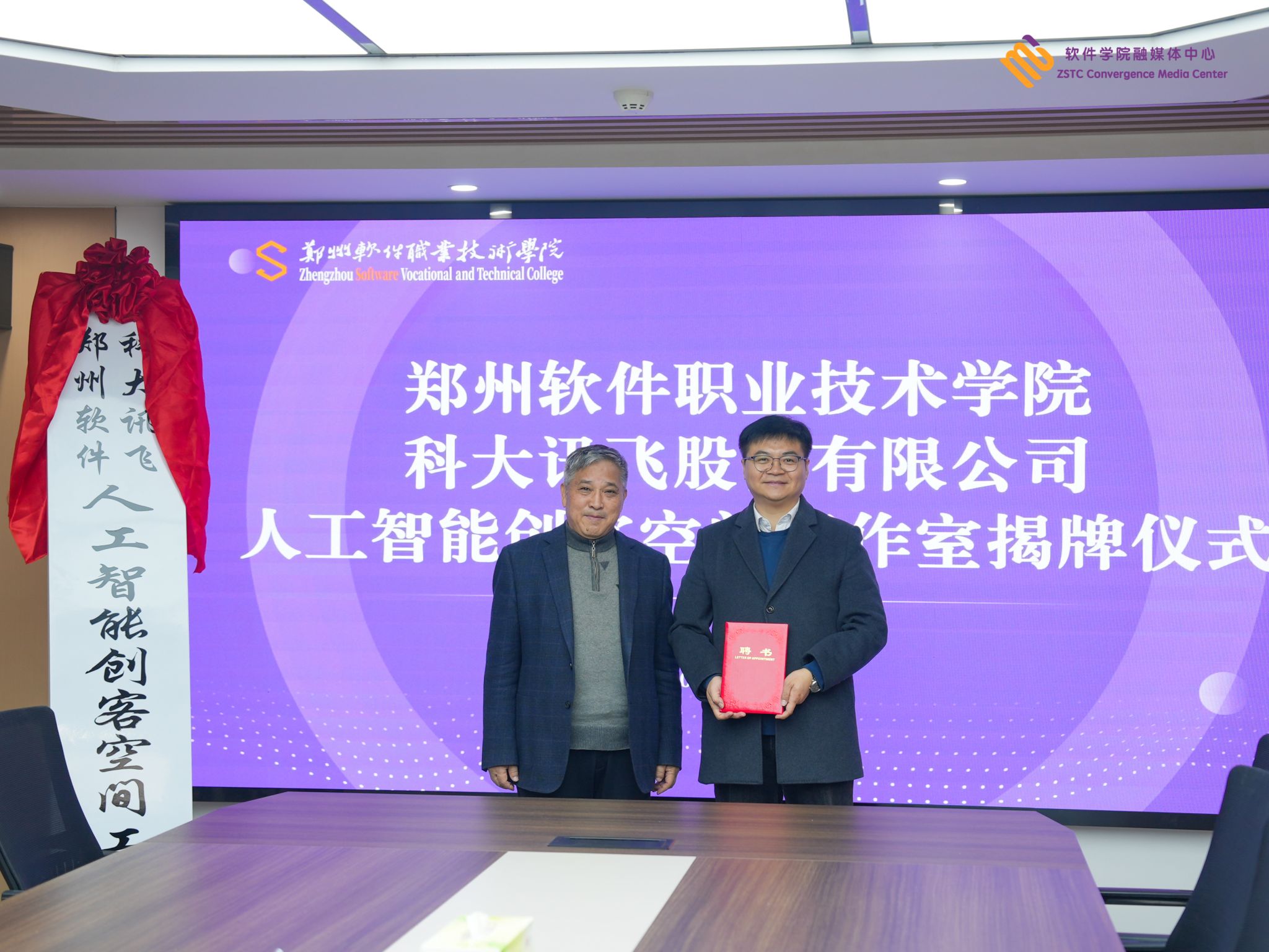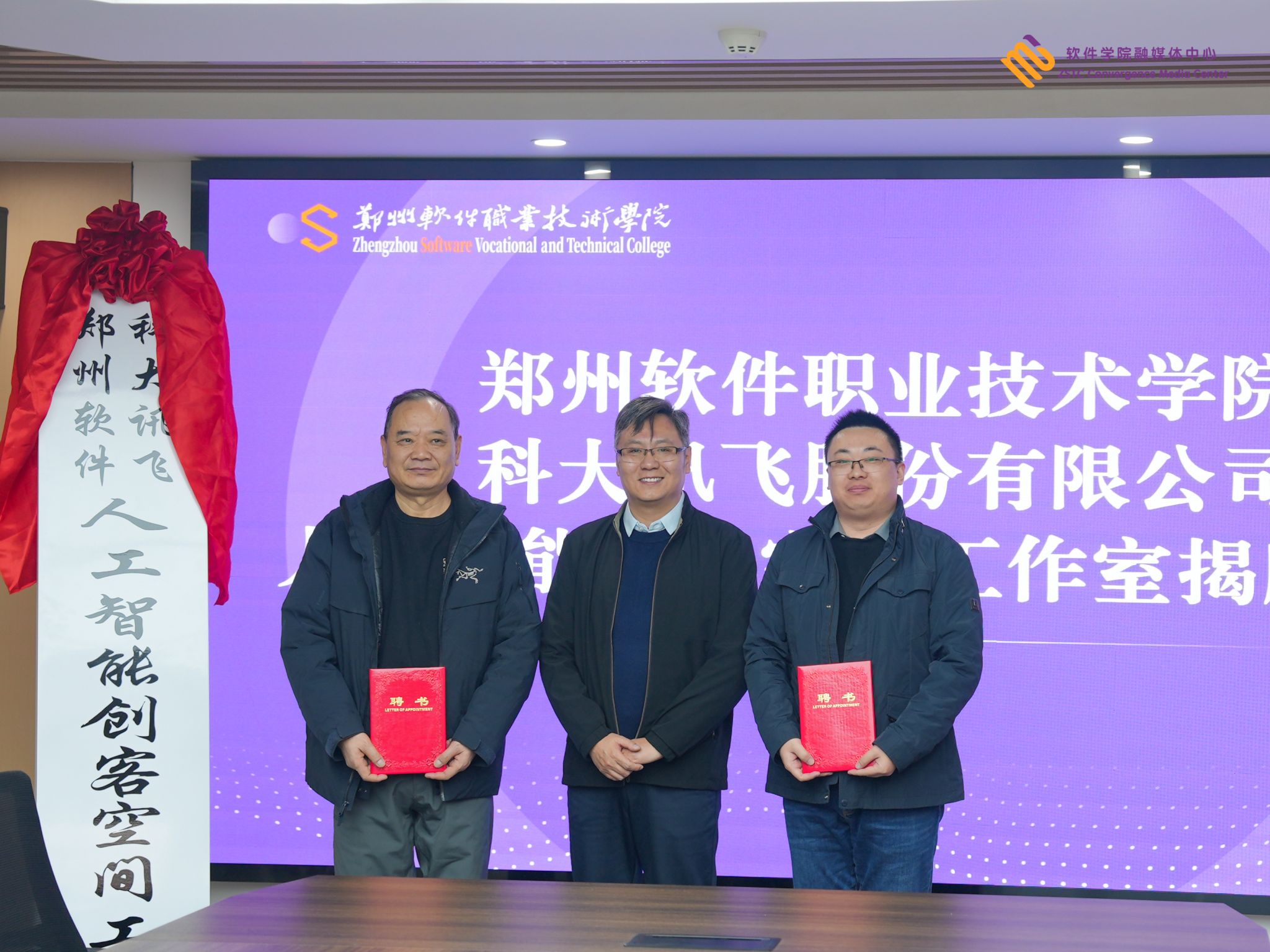 韩海鹏总监为科大讯飞产教融合业务线驻郑软项目总监陶磊🏌🏿、彩神人工智能学院院长王巍颁发“人工智能创客空间工作室管理委员会副主任”聘书🤷🏽。