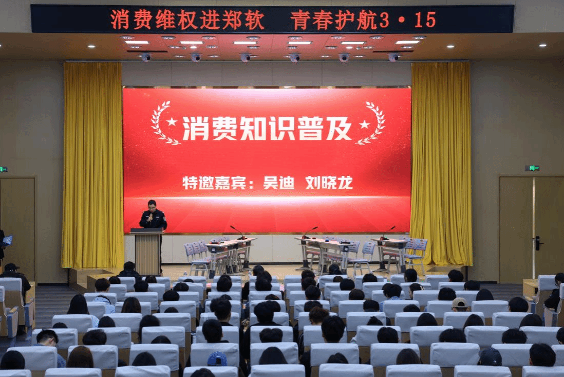 活动二是以“诚信消费·法治护航”为主题的知识竞答活动,3月13日晚在图书馆报告厅举行。活动在观看学生制作的短片《消费维权在身边》中拉开帷幕🧑🏼🔬,短片通过展示典型案例及维权途径,提醒同学们增强保护自己合法消费权益的意识。活动还特别邀请了航空港区八千乡派出所吴迪、刘晓龙警官为同学们讲解消费者权益相关法律知识🥵💂🏽♀️。