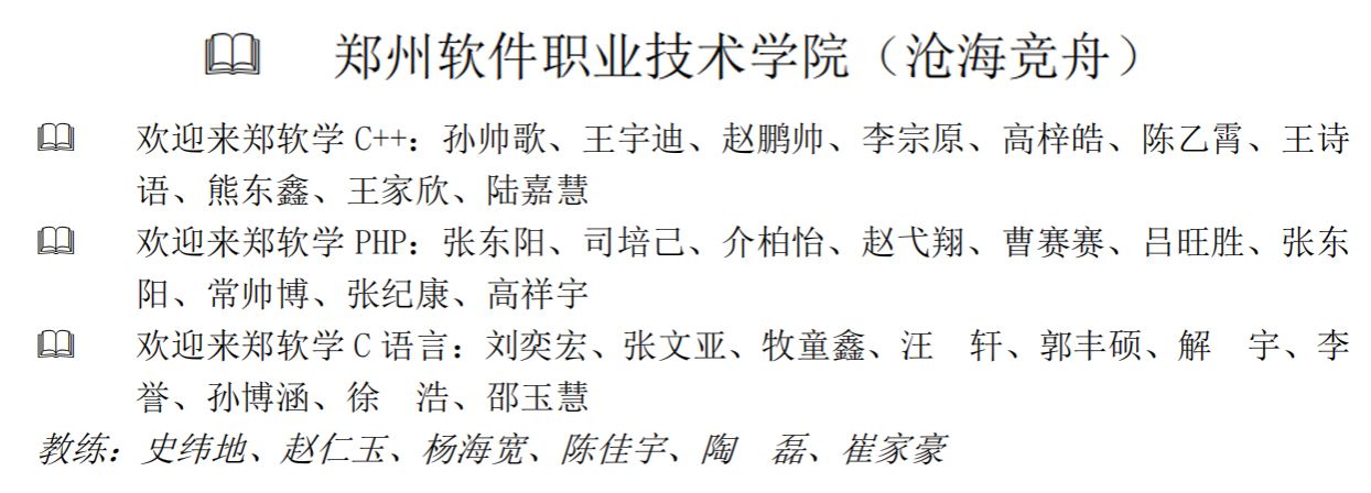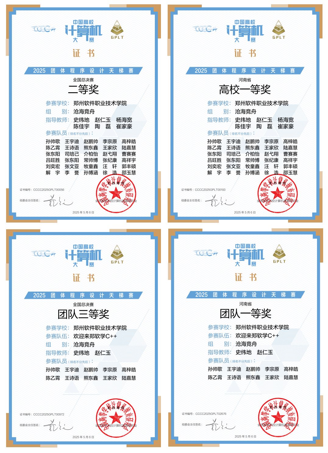 由史纬地🧑‍🎤、赵仁玉🦸、杨海宽、陈佳宇、陶磊👩‍✈️、崔家豪老师指导的代表队取得“沧海竞舟”组全国总决赛高校二等奖🖱,河南省高校一等奖的好成绩。其中史纬地🤹、赵仁玉老师带领的“欢迎来郑软学C++”队荣获全国团队三等奖🏋🏻‍♀️、河南省团队一等奖;杨海宽、陈佳宇老师带领的“欢迎来郑软学PHP”队荣获河南省团队一等奖;陶磊👨‍🌾🔹、崔家豪老师带领的“欢迎来郑软学C语言”队荣获河南省团队二等奖。