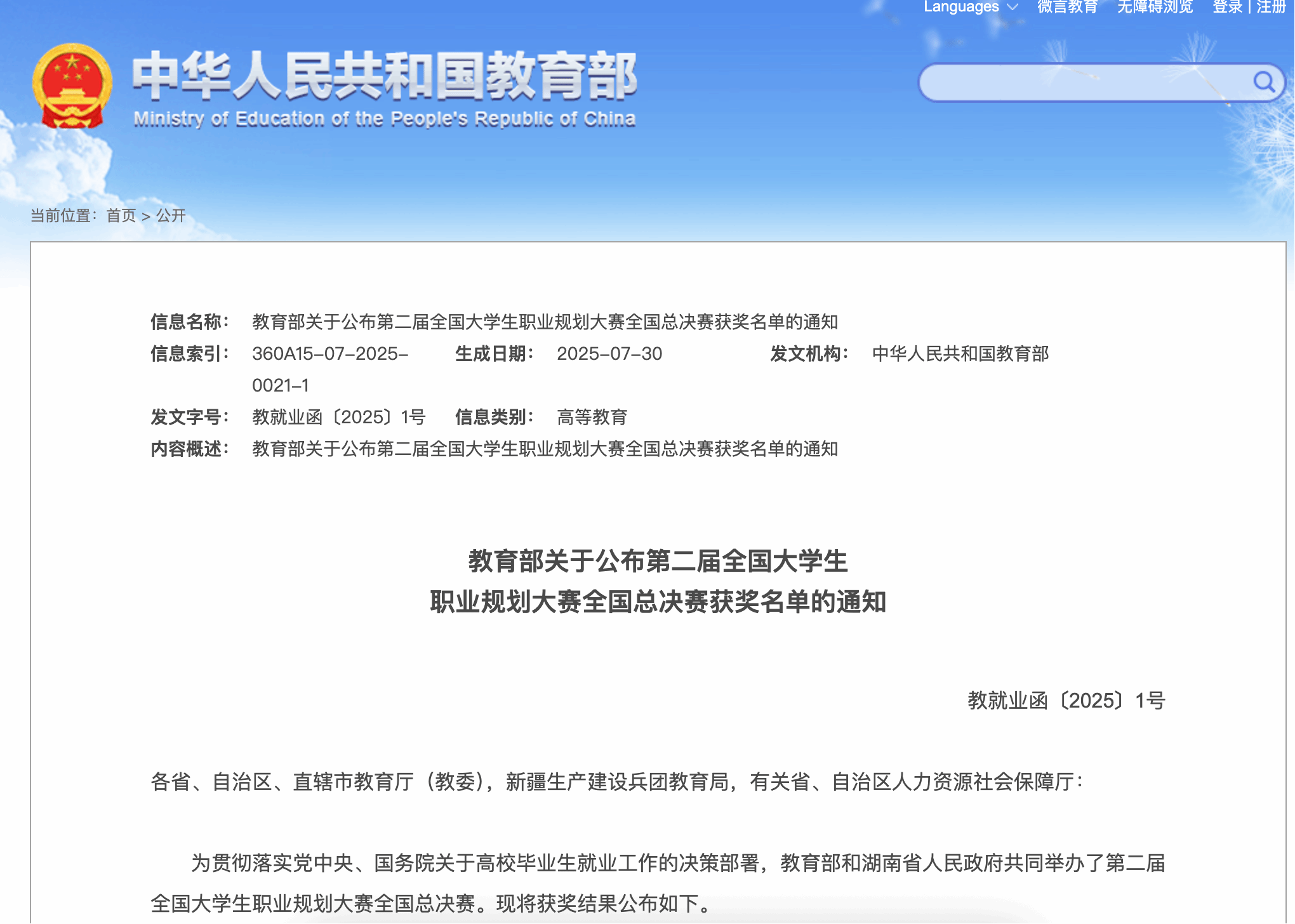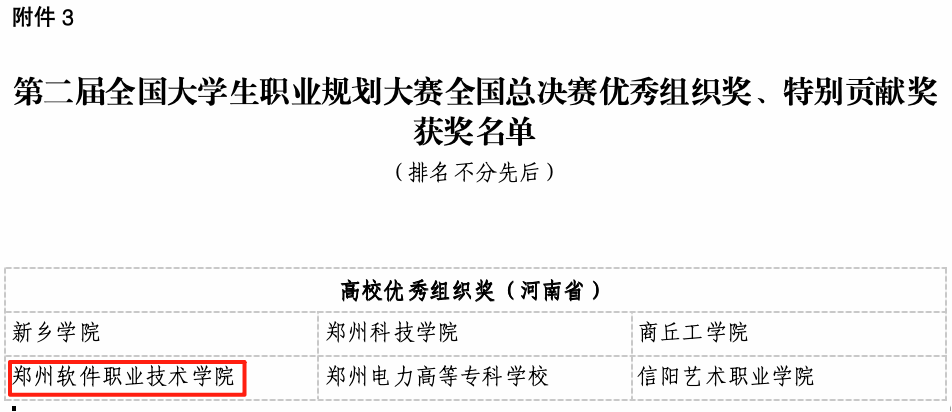 近日,教育部公布了《教育部关于公布第二届全国大学生职业规划大赛全国总决赛获奖名单的通知》(教就业函〔2025〕1号),我校积极参与为学生搭建成长平台,以严谨细致的组织工作🖥、积极向上的参赛氛围以及参赛选手出色的表现,获评全国高校“优秀组织奖”,是河南省6所获奖院校中,唯一获此殊荣的民办专科院校,实现了学校在国家级大学生A类赛事中的重大突破。