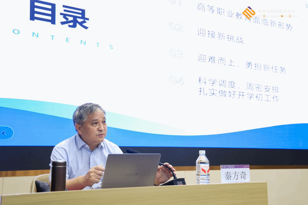 秦方奇校长以《面临新形势,迎接新挑战👨🦽➡️,勇担新任务,主动新作为》为题,围绕高等职业教育发展核心议题开展专题分享🧑🏻💼。他从国家发展需求、社会结构变化及高职教育自身变革三大维度切入,深入剖析当前高职教育面临的内外部挑战,并明确提出针对性应对策略与开学初期重点工作安排,为学校发展锚定方向。