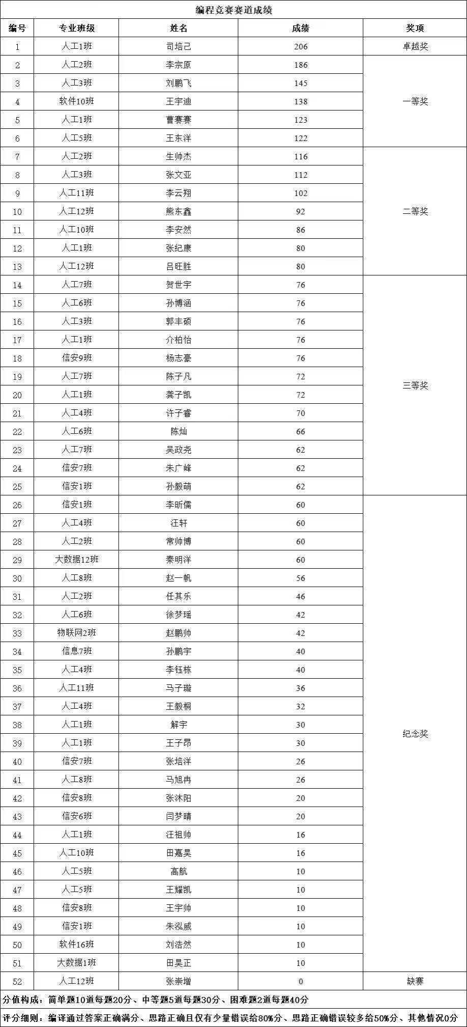 编程竞赛赛道卓越奖1名👩🏿🦲、一等奖5名🛢、二等奖7名、三等奖12名、纪念奖26名👆。