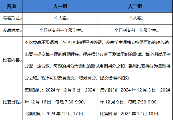 为顺利开展编程竞赛赛道,参赛学生需在2024年12月8日前进入报名群完成报名。比赛分为大一组和大二组,分别于2024年12月10日和12月17日下午14:30-17:30在四号教学楼指定机房进行现场编程👨🏻‍🦼。